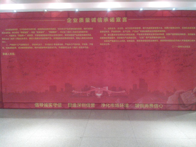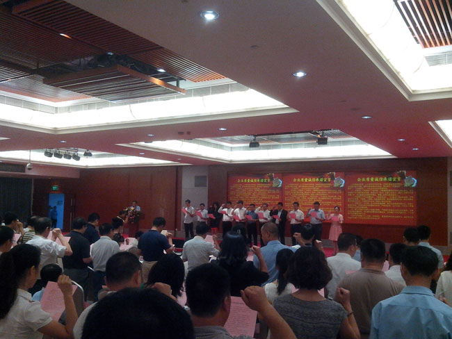 大會(huì)的高潮部分是所有與會(huì)的企業(yè)代表與政界代表一起舉起右手,宣讀《企業(yè)質(zhì)量誠(chéng)信承諾書》:為構(gòu)建誠(chéng)信經(jīng)營(yíng)、公平競(jìng)爭(zhēng)的市場(chǎng)環(huán)境,加強(qiáng)質(zhì)量誠(chéng)信體系建設(shè),切實(shí)保證產(chǎn)品質(zhì)量,維護(hù)消費(fèi)者的合法權(quán)益,推動(dòng)建設(shè)“質(zhì)量強(qiáng)國(guó)”,促進(jìn)“質(zhì)量強(qiáng)市”、“質(zhì)量惠民”。本企業(yè)向社會(huì)鄭重承諾:一、牢固樹立“質(zhì)量第一”的思想,不斷增強(qiáng)質(zhì)量意識(shí)和社會(huì)責(zé)任意識(shí),保證和提高產(chǎn)品質(zhì)量,落實(shí)企業(yè)質(zhì)量主體責(zé)任,滿足人們?nèi)罕妼?duì)高質(zhì)量產(chǎn)品的期待和需求,增強(qiáng)人民群眾的消費(fèi)信心。二、嚴(yán)格遵守《產(chǎn)品質(zhì)量法》、《標(biāo)準(zhǔn)化法》、《計(jì)量法》等法律法規(guī),嚴(yán)格執(zhí)行產(chǎn)品標(biāo)準(zhǔn),不制假、不售假,杜絕虛假宣傳,堅(jiān)決抵制假冒偽劣、欺詐消費(fèi)者等失信違法行為,不侵害其他企業(yè)合法權(quán)益。三、加強(qiáng)全員、全過(guò)程、全方位的質(zhì)量管理,推行先進(jìn)質(zhì)量管理方法,完善計(jì)量保證體系、標(biāo)準(zhǔn)化體系和質(zhì)量保證體系,嚴(yán)格原材料,生產(chǎn)過(guò)程、產(chǎn)品出廠和儲(chǔ)運(yùn)銷售全過(guò)程的照顧質(zhì)量控制。四、建立質(zhì)量安全事故主動(dòng)報(bào)告制度,嚴(yán)格落實(shí)質(zhì)量安全責(zé)任追究制度,完善產(chǎn)品質(zhì)量追溯體系,及時(shí)解決消費(fèi)者的質(zhì)量投訴,自覺履行產(chǎn)品質(zhì)量召回、“三包”等產(chǎn)品質(zhì)量責(zé)任和義務(wù)。本單位嚴(yán)格履行以上承諾。如有違反,愿意承擔(dān)相應(yīng)的法律責(zé)任,接受將失信違法行為納入不良信用記錄并向社會(huì)公開。二0一四年九月五日