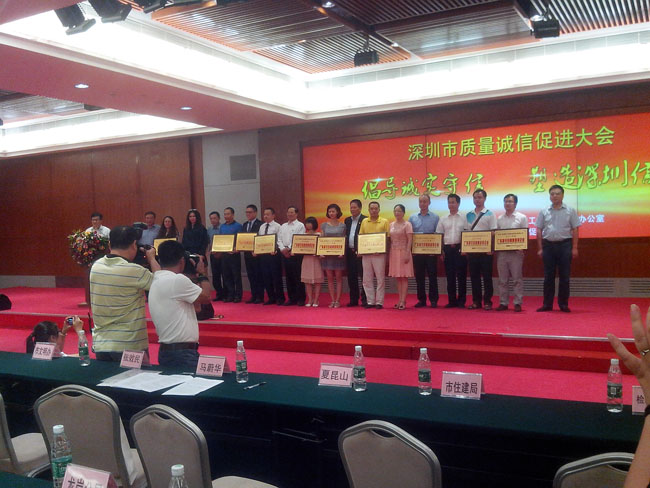 大會(huì)最后一項(xiàng)議程是頒發(fā)2013年“廣東省守合同重信用”證書及牌匾,我公司代表也受邀請(qǐng)上臺(tái)領(lǐng)取證書及牌匾。