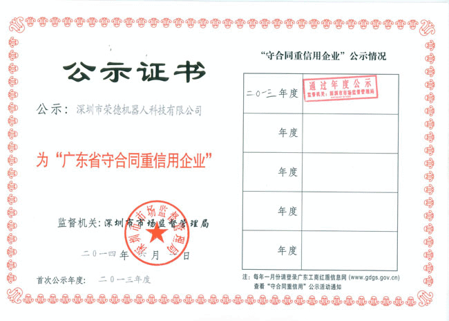 在此之際,非常感謝廣大客戶朋友對(duì)公司的認(rèn)可和滿意,只有客戶對(duì)公司的認(rèn)可,這樣公司合同才能夠嚴(yán)格履行,最終才能獲得該榮譽(yù)稱號(hào)。全體榮德人將會(huì)以此為契機(jī),將產(chǎn)品質(zhì)量和服務(wù)做到行業(yè)內(nèi)一流水平,滿足并不斷超越客戶需求。同時(shí)也請(qǐng)客戶放心選購(gòu)我司的噴涂機(jī)器人、自動(dòng)噴涂設(shè)備、自動(dòng)化生產(chǎn)線,獲得“廣東省名牌產(chǎn)品”的“守重企業(yè)”值得您的信賴,我們將會(huì)以最優(yōu)質(zhì)的質(zhì)量回報(bào)客戶、回報(bào)社會(huì),為深圳質(zhì)量的發(fā)展乃至全國(guó)質(zhì)量的發(fā)展貢獻(xiàn)自己的力量!