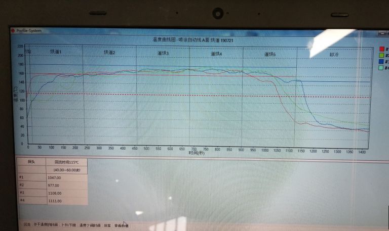 a噴涂生產(chǎn)線測(cè)溫 預(yù)熱設(shè)定120℃ ,烘烤5分鐘后溫度在90-120左右 ,沒有在±5的溫度范圍內(nèi),烘干線5節(jié)烤箱都設(shè)定170℃ ,只有 234節(jié)烤箱烤箱基本能在160-175這個(gè)溫度范圍內(nèi),沒有在總烘烤時(shí)間設(shè)定15分鐘, 需有12分鐘在165-175這個(gè)時(shí)間段內(nèi) b線測(cè)溫第一二節(jié)烤箱。