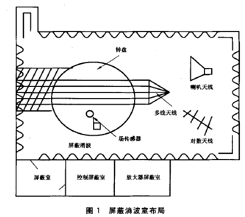 為 了 測(cè) 試操作者的安全,操作者必須被保護(hù)起來避免受到試驗(yàn)場(chǎng)所產(chǎn)生的高頻和高強(qiáng)度電磁場(chǎng)的傷害。即便是在人員稀少的鄉(xiāng)村,開闊場(chǎng)地是可以接受的,但若受法律限制,至少需要一個(gè)屏蔽室。由 屏 蔽 室改造的,具有部分隔襯的屏蔽室,是使用一定數(shù)量的能吸收射頻(RF)的材料來抑制無隔襯屏蔽室的主諧波。假如能建立一個(gè)均勻場(chǎng),進(jìn)行的輻射抗擾性測(cè)試就可得到承認(rèn)。另 一 方 面,考慮到機(jī)器人的尺寸,在對(duì)機(jī)器人進(jìn)行輻射抗擾性測(cè)試期間,要達(dá)到一個(gè)較好的均勻場(chǎng),推薦使用屏蔽消波室。即使局部隔襯的屏蔽室沒有消波室那么寬敞。圖 1 給 出了一個(gè)適合進(jìn)行機(jī)器人 EMC測(cè)試的屏蔽消波室的布局。除消波室之外,在機(jī)器人輻射抗擾性測(cè)試期間,一些鄰近的屏蔽室通常用于放置與機(jī)器人相關(guān)的測(cè)試儀器和設(shè)備。另 外 ,使 用適當(dāng)?shù)奶炀€(即多股的傳輸線)和采用適當(dāng)?shù)臏y(cè)試設(shè)備可改善電磁場(chǎng)的均勻性。